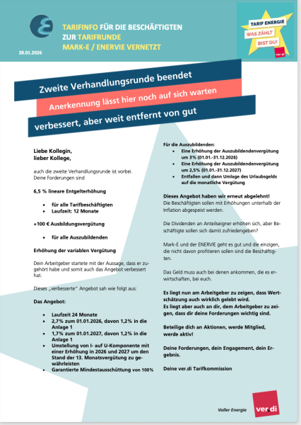 Auch die zweite Runde der Tarifverhandlungen in der Energiewirtschaft ist abgeschlossen. Klar ist: Unsere Forderungen liegen auf dem Tisch – und sie sind notwendig, gerecht und gut begründet.